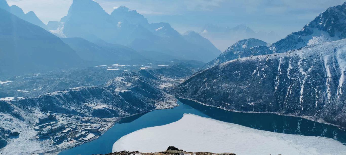 Jour 14 GOKYO4750M - GOKYO PEAK 5360M - DRAGNAG 4700M (En option, les plus motivés peuvent se lever aux aurores pour gravir le Gokyo Ri) La journée est consacrée à l’ascension du Gokyo Ri. Vue superbe sur l'Everest, le Lhotse, le Gyachung Kang, le Makalu.Nous retournons à Gokyo et Nous prenons le chemin qui va nous conduire au pied du Cho La. Traversée de la langue terminale du glacier Ngozumpa. Nuit au hameau de Dragnak. 5 à 6 h de marche. Hébergement : lodge. Repas inclus : matin, midi, soir.
